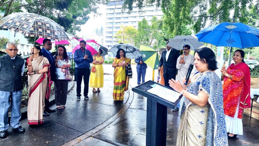 Rakesh Sharma, acting president of GOPIO Queensland, welcomed everyone as Prof Prasad Yarlagadda OAM was overseas. Anoop Nannuru, President of FICQ, was the next speaker. Dr. Maha Sinnathamby AM patron of FICQ and GOPIO Qld delivered a very inspirational speech. Mrs. Archana Singh, honorary counsel for India in Queensland, quite eloquently spoke of the relevance of Gandhi Ji’s teaching and philosophy in today’s day and age. In the absence of Jim Varghese AM, Nik Senapati represented GSML and delivered his speech. Dr. Sukhvir Singh spoke on behalf of Arya Samaj Queensland, and Rahul Modi said on behalf of BAPS Swami Narayan Temple. Mr. Hemant Naik and Kalpana Naik led the two popular Gandhi bhajans – Vaishnav Jan tene and Raghu Pati Raghav Ram.