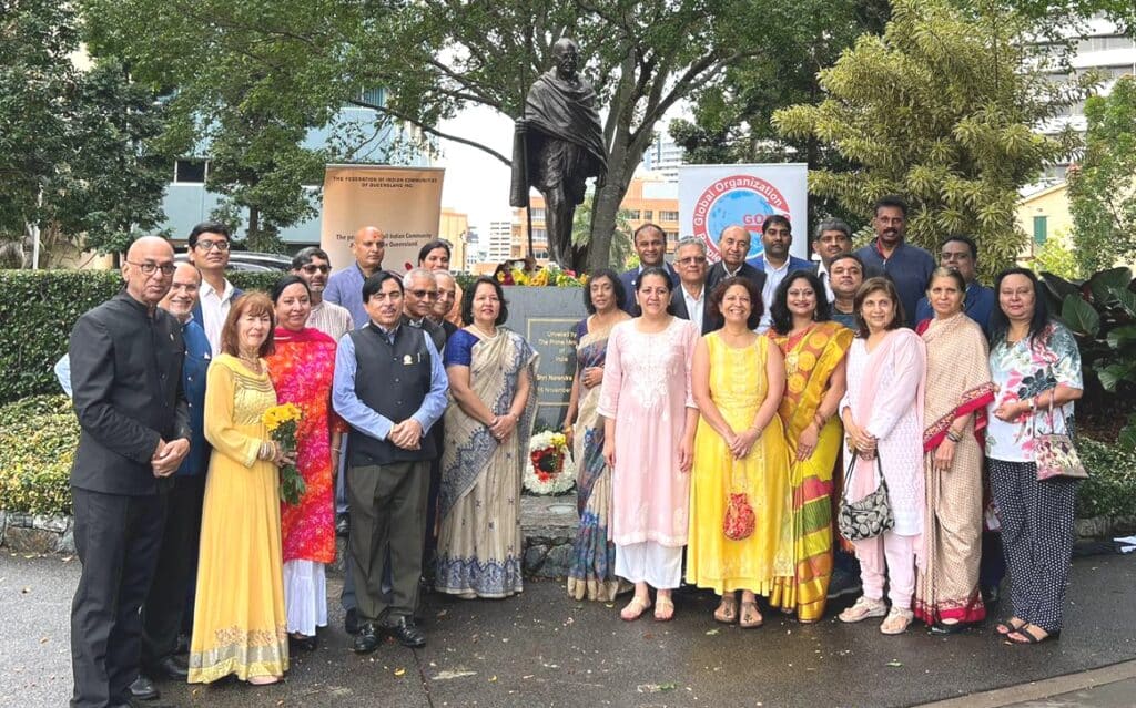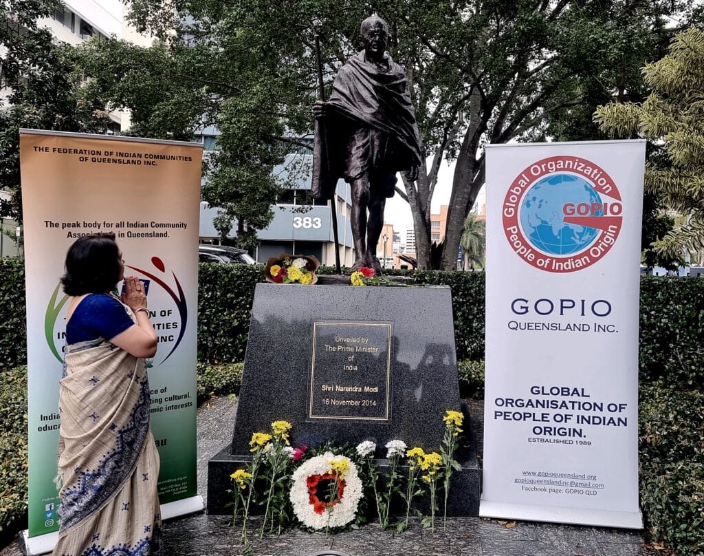 SPRING HILL, the annual Gandhi Jayanti organized by GOPIO Queensland and supported by FICQ, GSML, Gandhi Statue committee, and other organizations, was held at Gandhi statue near gate six of Roma Street Parkland prescient on 2nd October.
