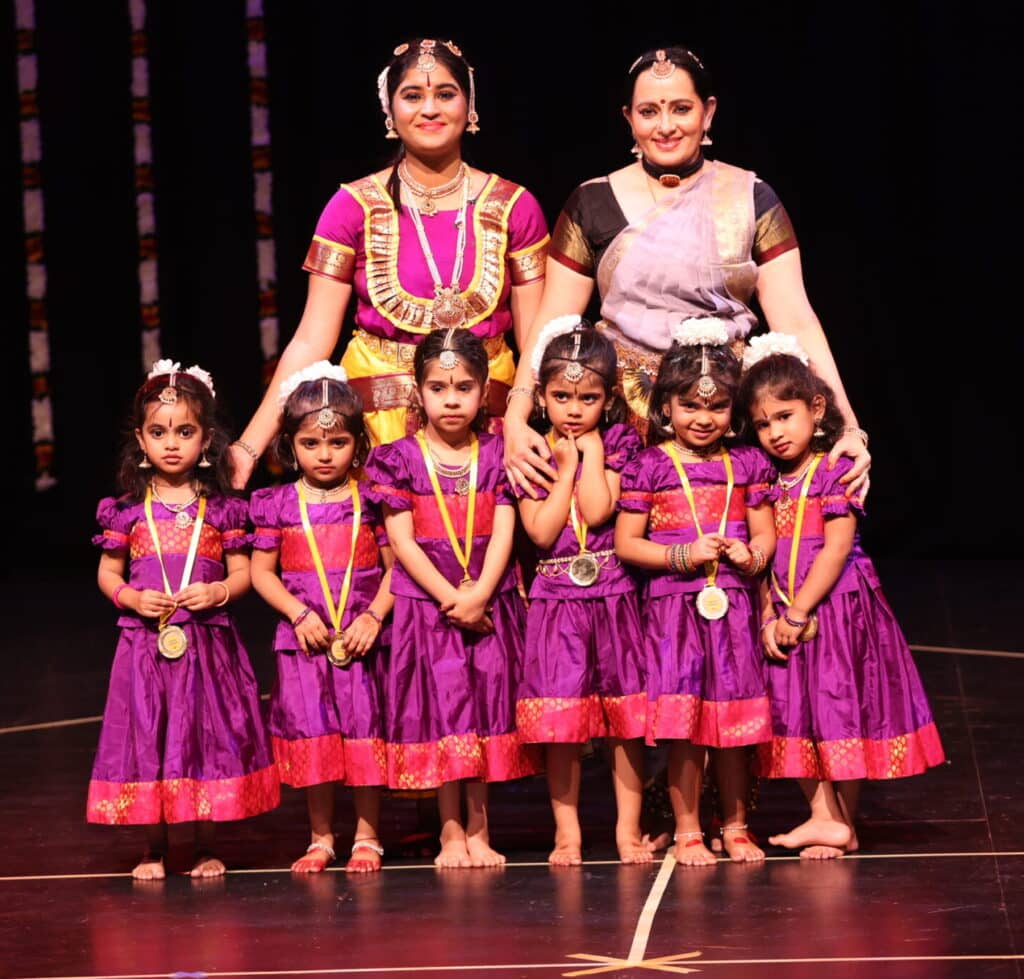 Lalithakalalaya School of Bharatanatyam has students who have just turned three. Teaching these students is not easy as it requires patience, effort and dedication. It was a proud moment for the parents to see their children on stage and demonstrating the mudras and Ganesha slokam while chanting.
